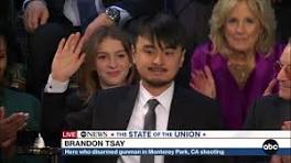 Biden recognizes Brandon Tsay, who disarmed Monterey Park shooter, during State of the Union He devoted a portion of his speech to policing reform and gun violence, with an emotional moment when he asked Brandon Tsay to stand.